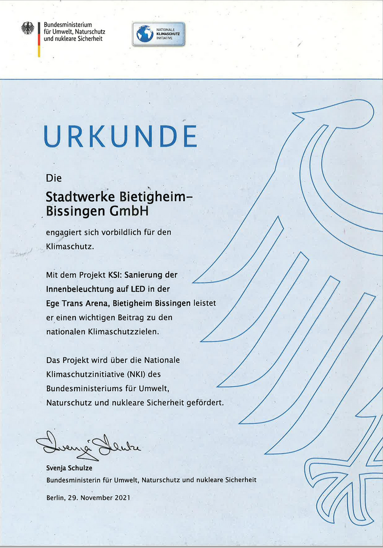 Mit der Sanierung der Innenbeleuchtung der EgeTrans Arena (Umstellung auf LED) leisten die Stadtwerke einen wichtigen Beitrag zu den nationalen Klimaschutzzielen. Dies zeichnete das Bundesministerium für Umwelt, Naturschutz und nukleare Sicherheit auch offiziell aus.